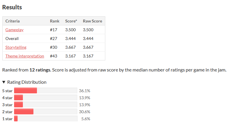 Not gonna lie, when the community vote was revealed, I was a little disappointed to rank low on Theme Interpretation, but I was happily surprised to rank #27 overall \^o^/. Now that I understand ArcScript better, I'm going to work on more personal projects. Why pay for therapy when you can create games?